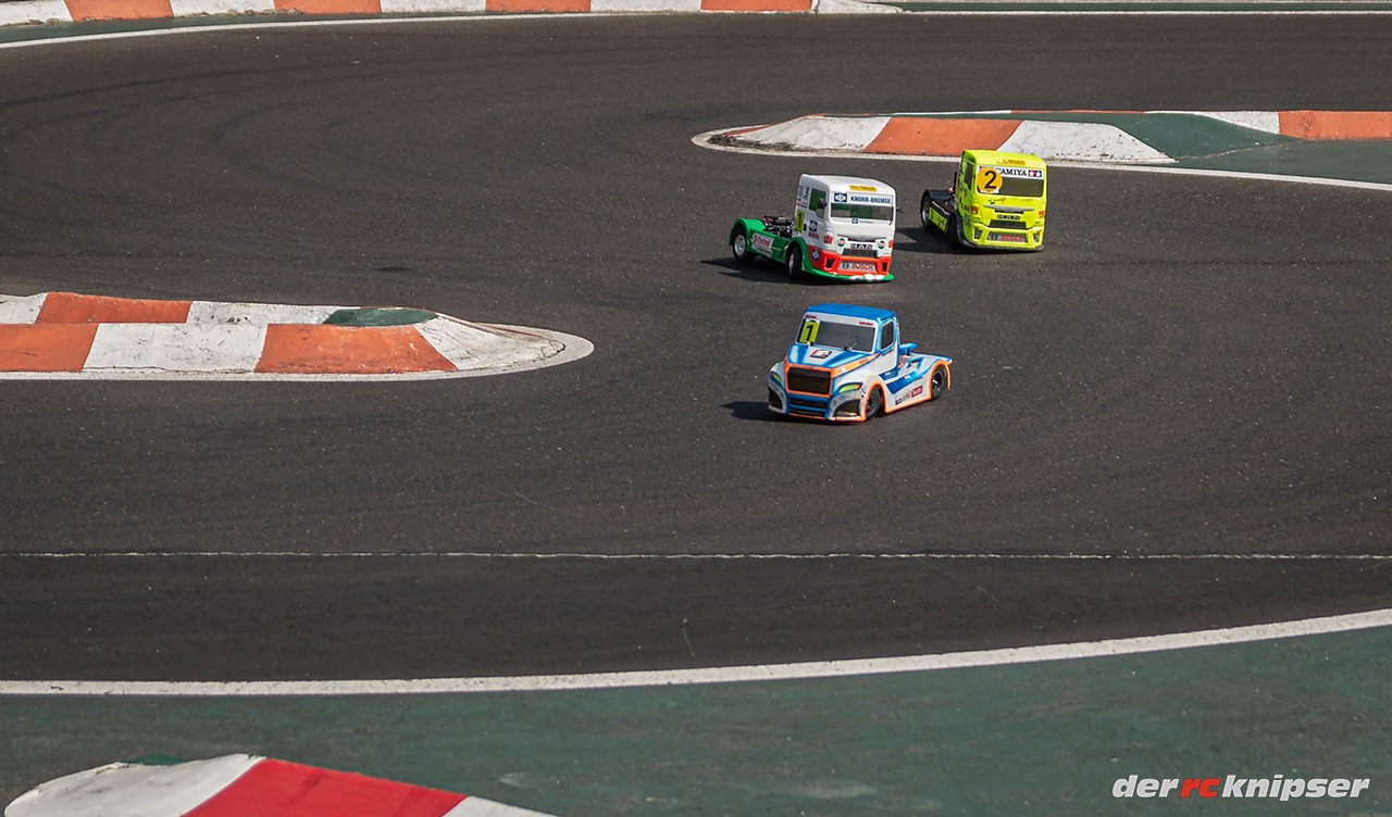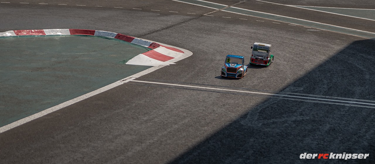 Jetzt muss ich das ändern. Hier mal ein Bild, wie der Truck in Kurven liegt. Meiner ist der hintere Castrol MAN.
