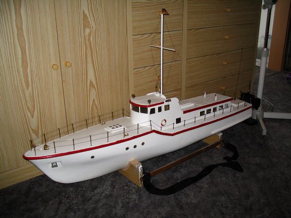 habe ein schiff geschenkt bekommen. ziemlich gross, 140cm lang. war ziemlich aufbearbeitungsbedürftig. war schon halb auseinandergenommen, sollte wohl neu lackiert werden. nunja motor war mit dabei und ich habs neu angepinselt und wieder so zusammengebaut wie ich vermute das es vorher aussah bis auf die farbe. der rumpf war vorher grün mit roter wasserlinie. scheint auf jedenfall rcht alt zu sein. ich vermute mal es ist eine eigentkonstruktion. der rumpf ist aus gfk und der aufbau aus holz. was soll das wohl darstellen? eine alte passagierfähre ?